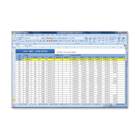 급여 자동계산 관련한 기초정보를 입력/수정하는 시트 화면입니다. 국민연금, 건강보험, 장기요양보험, 고용보험 등의 납부액 산출을 위한 기초자료를 입력/수정하며, 파일을 구매 하시면, 2014년 2월 말 기준, 최신 자료가 이미 입력되어 있습니다. 지급 급여를 입력하는 것만으로도 쉽게 급여작업을 끝낼 수 있습니다!