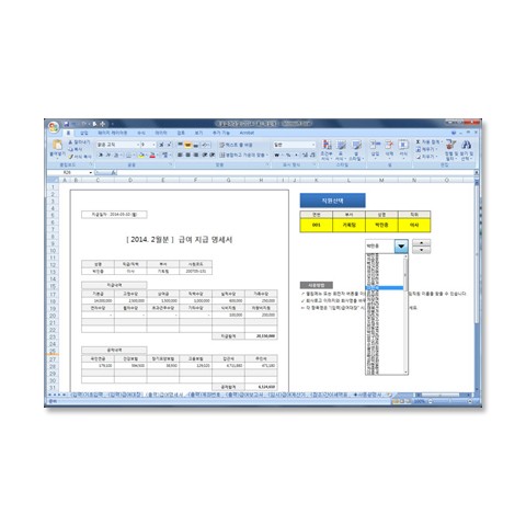 산출된 급여대장은 근로자 개인별로 지급할 “급여 지급 명세서” 시트와도 연동되는데, “급여 지급 명세서” 시트에서는 임직원 명을 펼침메뉴 버튼과 회전자 버튼을 이용해 편리하게 찾을 수 있습니다.